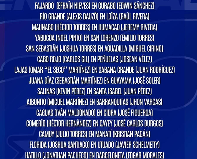 Jornada del fin de semana La jornada del viernes, tiene partidos suspendidos. Los partidos de la Sección Metro, además de Juncos en Rio Grande, Utuado y Camuy, además de los partidos de los Fundadores de Añasco.