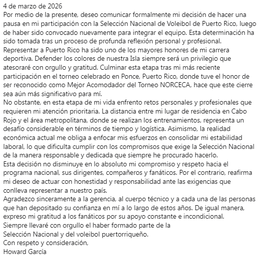 Superior Masculino, Howard García, anunció que tomará