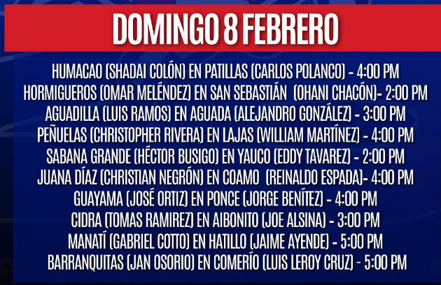 Jornada del fin de semana La jornada del viernes, tiene partidos suspendidos. Los partidos de la Sección Metro, además de Juncos en Rio Grande, Utuado y Camuy, además de los partidos de los Fundadores de Añasco.